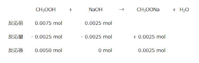 0.0075 (mol) のうちの 0.0025 (mol) が水酸化ナトリウムと反応してしまうので、反応後の酢酸水溶液の物質量は 0.0075 (mol) - 0.0025 (mol) より 0.0050 (mol) となります。